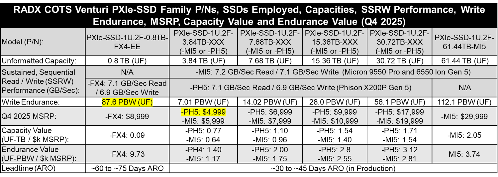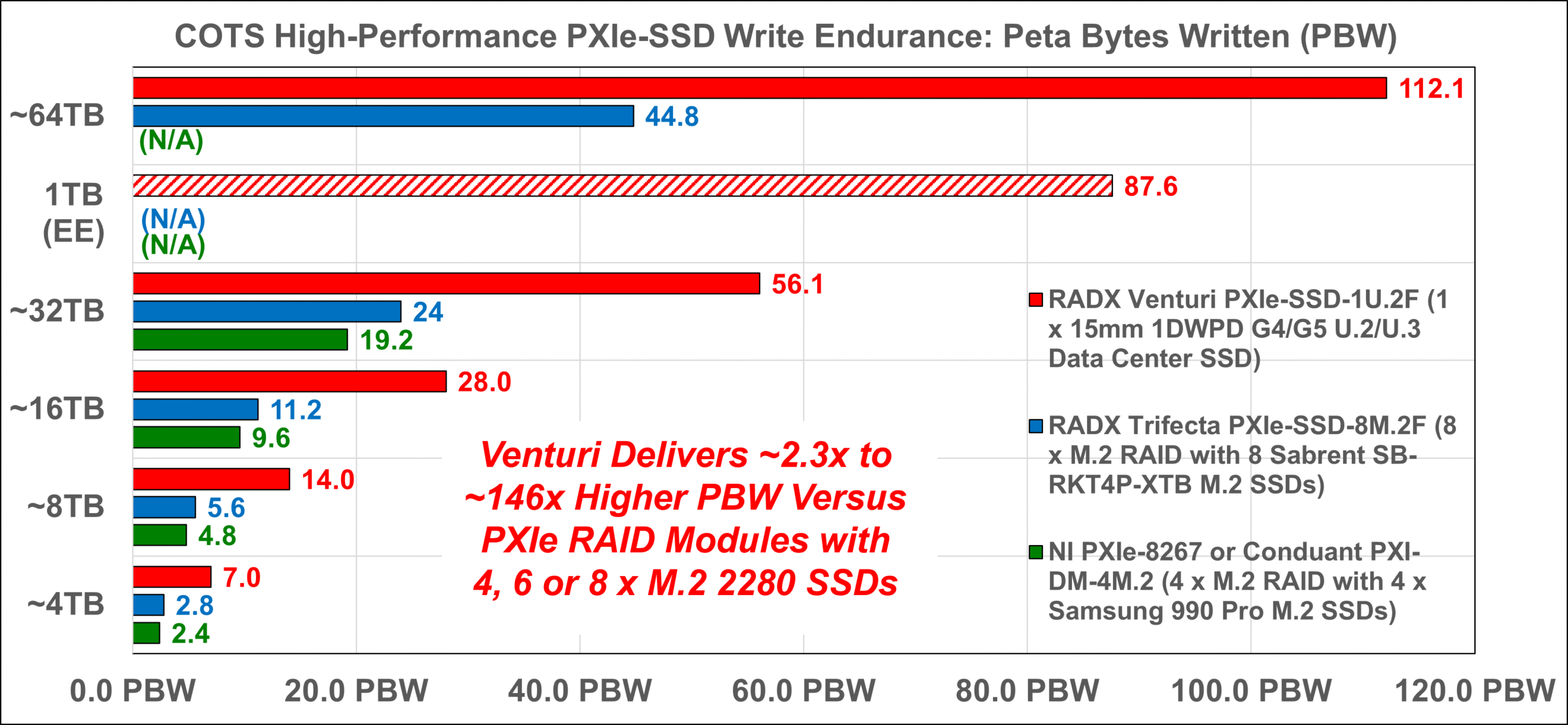 Industry-Leading Capacities and Write Endurance – Standard Venturi PXIe-SSD models include 7.68TB, 15.36TB, 30.72TB, and 61.44TB (unformatted) capacities, with ~24TB and other capacities available upon request. In addition, the Venturi Family includes a new, low-cost 3.84TB model ($5k MSRP) and an Extreme Endurance 800GB model (87.6 PBW) that’s optimized for continuous write and circular-buffer applications. With its Data Center SSDs, Venturi can support write endurance between 7 and 112 Petabytes Written (“PBW”), which is 2.3x to 146x higher than similar capacity M.2 RAID products with 4, 6 or 8 x M.2 SSDs. This enables Venturi to offer unrivalled support for wideband recording applications that require thousands of write cycles.
