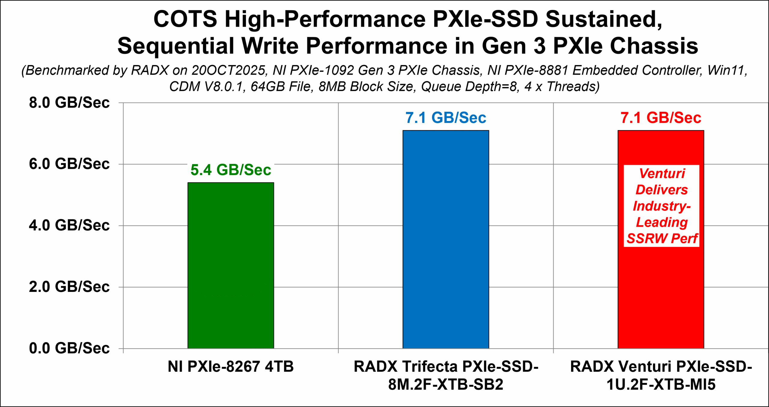 Venturi PXIe-SSDs incorporate unique, patent-pending RADX technology that enables 15mm, PCIe Gen 4 and Gen 5, Data Center U.2 and U.3 NVMe SSDs to deliver Sustained, Sequential Read and Write (SSRW) performance of up to ~7.2 GB/Sec Read and ~7.1 GB/Sec Write in PXIe Gen 3 chassis. ~7.2 GB/Sec Read and ~7.1 GB/Sec Write is effectively the upper limit for SSRW in Gen 3 PXIe systems and is equivalent to the performance achieved by RADX Trifecta PXIe-SSD RAID modules with 8 x M.2 2280 NVMe SSDs.